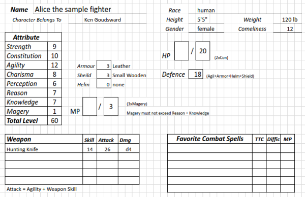 The standard hunting knife has a default skill level = AGILITY, so Alice starts out with Knife Skill = 12. Not bad, but she chooses to spend her 20 initial XP on upgrading that skill. At 10XP/level, she is able to upgrade to Knife Skill = 14.